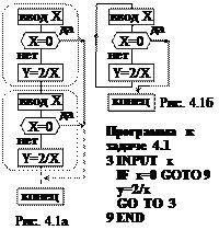 Очевидна следующая (рис. 4.1а) блок-схема. Блоков ввода, вычисления и анализа столько, сколько чисел в последовательности до первого нуля. На рисунке показаны только два первых блока. Чисел может быть очень много и подобный подход, конечно, неприемлем, не говоря уже о том, что и количество их заранее неизвестно. Такие программы строятся по-иному. Обрабатывающая часть программы записывается только раз, но охватывается петлей возврата (рис. 4.1б). Тогда одни и те же операторы будут выполняться многократно до тех пор, пока X¹0.