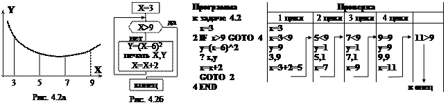 Задача 4.2. Пусть для аргумента X, находящегося в диапазоне от 3 до 9, требуется вычислить и напечатать значение функции Y=(X–6)2, где X изменяется с шагом 2 (рис. 4.2а). Блок-схема алгоритма показана на рис. 4.2б.