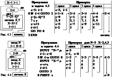 После выполнения очередного цикла счетчик получает приращение, увеличиваясь на единицу (I=I+1). В начале каждого цикла в операторе IF делается проверка на достижение счетчиком последнего разрешенного значения (у нас 4). Если I<=4 программа продолжает вычисление функции, если нет (I>4) – счет прекращается. Ниже приведена программа и выкладки по ее проверке. Как видим, результат проверки совпал с результатом, полученным ранее.