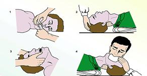 Признаки: отсутствие пульса, сердцебиения, реакции зрачков на свет (зрачки расширены), немедленно приступают к непрямому массажу сердца. Наиболее эффективно использование для искусственного дыхания специальных аппаратов, с помощью которых вдувается воздух в лёгкие. При отсутствии таких аппаратов искусственное дыхание делают различными способами, из которых распространён способ «изо рта в рот» (рис. 4.3.).