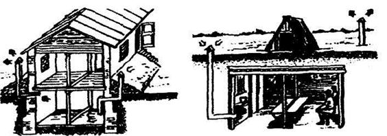 Размещают ПРУ в помещениях, расположенных в подвальных и цокольных этажах зданий (рис. 9.), на первых этажах кирпичных зданий, а также погребов, подпольев, овощехранилищ и других пригодных для этой цели заглубленных пространств (рис. 10.) заключается в выполнении работ по повышению их защитных свойств, герметизации и устройству простейшей вентиляции.