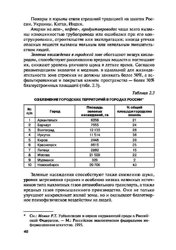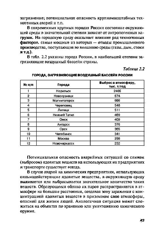 Интенсивный рост городов в XX в.. концентрация основной массы населения на территориях, насыщенных промышленными предприятиями, транспортными магистралями, породили целый ряд проблем, в том числе и общую проблему безопасности человека. В городах, особенно в крупных, сосредоточен целый ряд промышленных производств и таких экологически опасных, как металлургическое. машиностроительное, химическое, нефтеперерабатывающее. целлюлозно-бумажное, а также объекты энергетики, неотъемлемой частью которых являются мошные выбросы в окружающую среду отходов", тепловое электромагнитное, шумовое