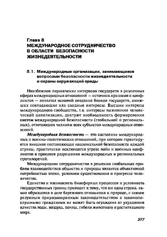 Международные организации как постоянно действующие структуры, располагающие собственными интеллектуальными. техническими и финансовыми ресурсами и обладающие определенной политической независимостью по отношению к участвующим государствам, представляют собой инструмент, наилучшим образом приспособленный для решения тех задач, которые возникают в ходе осуществления международного природоохранительного и жизнеобеспечивающего сотрудничества. Международные организации. занимающиеся вопросами безопасности жизнедеятельности, осуществляют контроль за выполнением принятых договоренностей, координацию совместных усилий по охране окружающей среды и привлечению внимания общественности к экологическим проблемам.