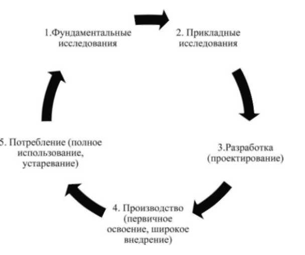 Как правило, выделяются пять основных фаз жизненного цикла инноваций - процесса создания, коммерциализации и использования новшества (рис. 1):