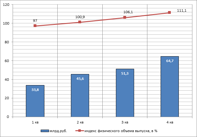 Рисунок 2 показывает, что в течение отчетного года динамика данного показателя характеризуется положительной тенденцией, кроме I квартала. Сводный индекс возрос с 97 % в I квартале до 111,1 % в IV квартале, во II и III кв. составили соответственно 100,9 и 106,1 % [5]. Снижение данного индекса на 3 % в I квартале 2012г. произошло за счет снижения индекса физического объема в обрабатывающих производствах на 38%. Оборот организаций по полному кругу промышленных предприятий в 2012 году составил 88366,8 млн. рублей, в основной капитал республики направлено 40% инвестиций примышленного производства. Основные показатели промышленного производства республики характеризуются следующими данными, таблица 1 [4].