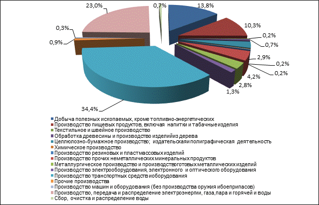 Из рисунка 3 видно, что основную долю в объеме отгруженной продукции занимает производство транспортных средств и оборудования (34,4%), производство и распределение электроэнергии, газа и воды (23,0%), добыча полезных ископаемых, кроме топливно-энергетических (13,8%) [4].