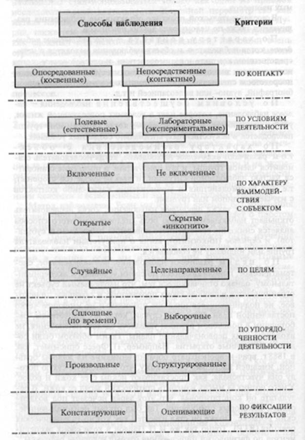 На схеме представлены основные способы наблюдения и взаимосвязи между ними. По этой схеме можно проследить, как структурно образуются самые разнообразные модели наблюдения. Например, методически оно может быть организовано как: непосредственное - полевое - не включенное - открытое -целенаправленное - выборочное - структурированное -оценивающее и т.п.
