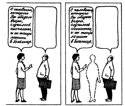 Методика состоит из 24 рисунков, на которых изображены лица, находящиеся во фрустрационной ситуации. Один из персонажей произносит фразу, которая либо фрустрирует другого, либо описывает суть фрустрирующей ситуации (см. рис. 1). Испытуемый должен дать за второго персонажа любой пришедший ему на ум ответ. Ответы испытуемого анализируются с целью выявления агрессии и характера ее направленности (на себя, на других). Тип реакции агрессии различается по тому, что оказывается более значимо для испытуемого: а) препятствия, вызывающие фрустра-цию, б) обвинения, упреки, порицания, вызывающие его активную самозащиту, в) потребность найти конструктивное решение конфликтной ситуации.