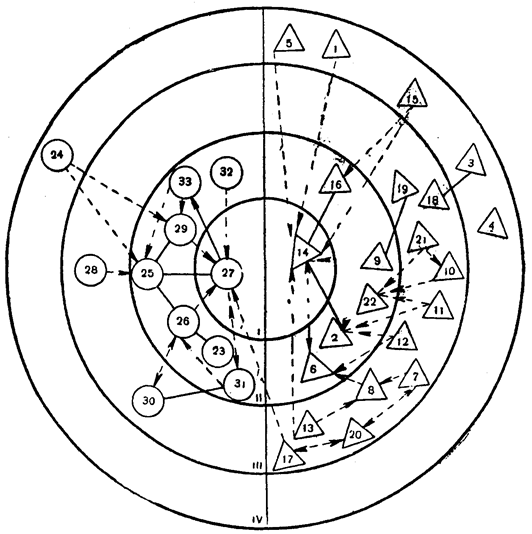 Американским психологом Дж. Морено бьш предложен способ выявления межличностных предпочтений в группах и техника фиксирования эмоциональных предпочтений, которая была- им названа социометрией. С помощью социометрии можно выяснить количественную меру предпочтения, безразличия или неприятия, которую обнаруживают члены группы в процессе межличностного взаимодействия. Социометрия широко используется для выявления симпатий или антипатий между членами группы, которые сами могут не осознавать этих отношений и не отдавать себе отчета в их наличии или отсутствии. Социометрический метод весьма оперативен, его результаты могут быть математически обработаны и графически выражены (социометрическую карту групповой дифференциации см. на рис. 21).