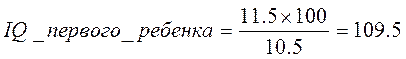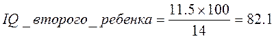 Если бы, например, в результате тестирования одну и ту же сумму очков (120) набрали два ребенка (десяти с половиной и четырнадцати лет) и, таким образом, умственный возраст каждого был бы приравнен к одиннадцати с половиной годам, то коэффициент умственной одаренности детей был бы вычислен следующим образом: