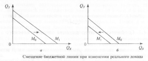 2. Расположение бюджетной линии зависит от величины денежного дохода. Увеличение денежного дохода потребителя при неизменных ценах приводит к параллельному перемещению бюджетной линии вправо (рисунок а). Уменьшение денежного дохода потребителя при неизменных ценах приводит к параллельному перемещению бюджетной линии влево (рисунок б). Изменение дохода потребителя не меняет угла наклона бюджетной линии, но меняет координаты точек пересечения бюджетной линии с осями координат.