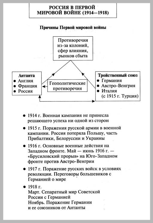 Первая мировая война явилась следствием противоречий, возникших между государствами Тройственного союза (Германия, Италия, Австро-Венгрия) и Антанты (Россия, Англия, Франция). В основе этих противоречий был конфликт между Англией и Германией, включающий экономические, военно-морские и колониальные притязания. Между Францией и Германией шли споры из-за отторгнутых у Франции районов Эльзаса и Лотарингии, а также претензий Германии на колонии Франции в Африке.