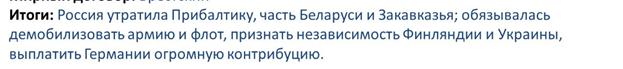 Россия потеряла Польшу, Литву, Латвию, часть Белоруссии. Исключалось военное присутствие Советских войск в Прибалтике, Финляндии, на Украине.