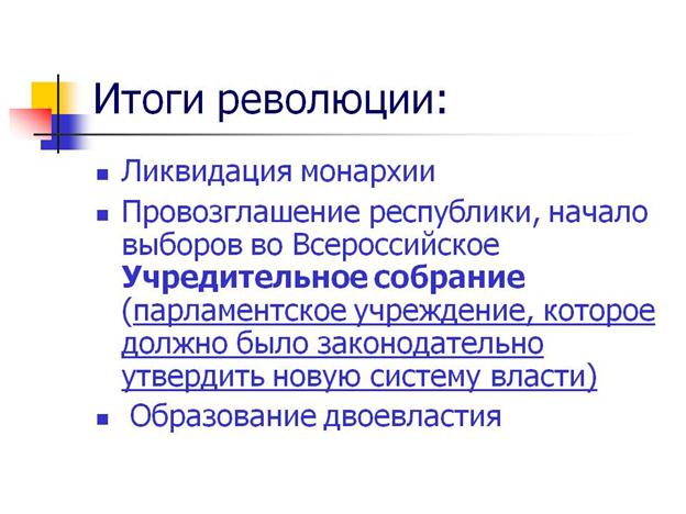 В итоге октябрьской революции большевики одержали победу, установилась диктатура пролетариата. Классовое общество было ликвидировано, помещичья земля передана в руки крестьянам, а промышленные сооружения: фабрики, заводы, шахты – в руки рабочих.
