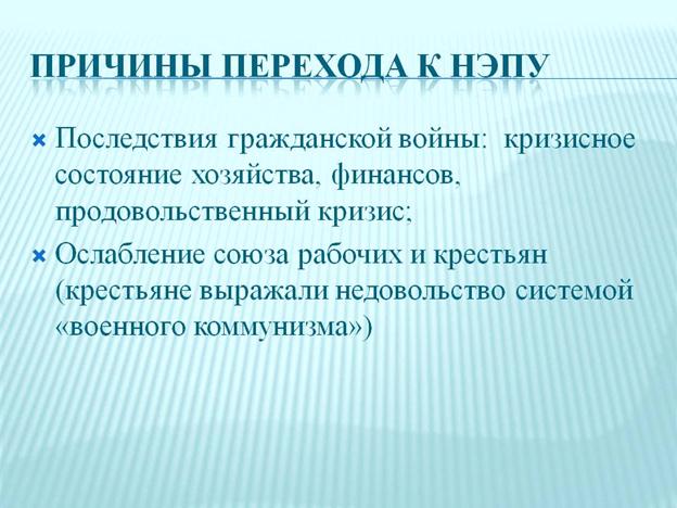 Причины перехода к НЭПу. Кронштадт пал, но заставил власть, по выражению Ленина, “глубоко задуматься”. Кронштадтский мятеж был расценен как опасный политический кризис, который Ленин считал страшнее Деникина, Колчака и Юденича вместе взятых. Лозунги восставших совпали с лозунгами меньшевиков и эсеров.