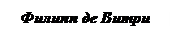 Ключевая фигура во Французской музыке XIV века – Филипп де Витри. Знаменитый поэт, композитор и музыкальный теоретик Филипп Витрийский (родом из города Витри в Шампани) родился 31 октября 1291 года, умер 9 июня 1261 года в Париже. Учился в Сорбонне, получил степень магистра искусств. Помимо поэзии и музыки, его интересовали философия, математика, астрономия и древняя литература. Он был крупным политическим и церковным деятелем эпохи, министром и советником трех французских королей. Последние 10 лет своей жизни - епископом в Мо. Сохранилось немногим более 10 мотетов[99] Витри (Н. Симакова говорит о 13 латинских и 1 французском мотете). К сожалению есть лишь свидетельства современников о том, что Витри писал баллады, рондо и ле. Тексты для них сочинялись самим композитором. Петрарка характеризовал Витри как «первого поэта в нынешней Галлии, страстного искателя правды». Поэтическое содержание мотетов многообразно. Выделяются мотеты-памфлеты, мотеты-басни (в них в аллегорической форме обличаются произвол светской и духовной властей) и мотеты-проповеди с традиционной духовной тематикой.