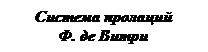 Подлинность всего теоретического наследия, приписываемого Витри, – 4-х трактатов – сегодня подвергается сомнению. Лишь “Ars nova” не вызывает разногласий в авторстве. Тем не менее, нельзя оспаривать тот факт, что именно Ф. де Витри в своих сочинениях и теоретических трудах создает новое – мензуральное[100] – учение. В последней главе трактата “Ars Nova”– “De tempore imperfecto” («О несовершенном темпусе») Витри излагает учение о пролации (prolatio – буквально означает проговаривание, произношение). Согласно этому, существует два вида темпуса – перфектный и имперфектный, и две пролации – большая и малая. Тем самым можно определить 4 способа деления бревиса и семибревиса. Первый уровень деления бревиса дает два варианта: perfectus (совершенное) – в одном бревисе содержится 3 семибревиса и imperfectus (несовершенное) – в одном бревисе – 2 семибревиса. Второй уровень обозначает деление семибревиса на минимы. Большая пролация – major – определяет соотношение 3-х миним в одном семибревисе; малая пролация – minor – соответствует 2-м минимам в одном семибревисе. В трактате “Ars perfecta”, чья принадлежность Витри оспаривается, введены знаки для видов сочетания темпуса и пролации: