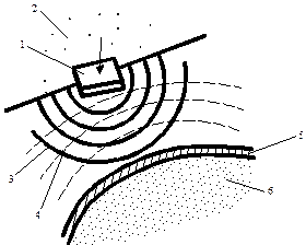 1 – металлическая плита; 2 – точка установки прибора регистрации на поверхности грунта для регистрации локации; 3 – распространение ударной волны по толще грунта;