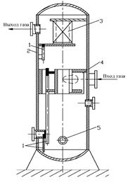 В объемных сепараторах (рис. 3.1, а) газовая смесь поступает в устройство направления потока 4, в котором под действием силы тяжести, механические примеси осаждаются и поступают в нижнюю часть корпуса аппарата 2. Далее газ поступает через каплеуловительную насадку 3, где удерживается жидкая фаза, которая сливается по дренажной трубке 1 в нижнюю часть аппарата. Накопившийся шлам (жидкость и механическая взвесь) в корпусе аппарата удаляется через сливной патрубок 5.