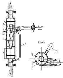 3 – жалюзийная насадка (каплеуловитель); 4 – устройство для направления потока газа; 5 – патрубок (дренаж) для слива жидкости; б – циклонный сепаратор: 1 – корпус;