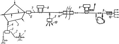 Передача газа из МГ в распределительные газопроводы осуществляется через газораспределительные станции (ГРС) 9, в которых производится очистка газа, снижение его давления и дополнительная одоризация.