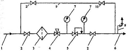6 – выходной газопровод; 7 – манометр; 8 – предохранительный сбросной клапан; 9 – байпас; 10 – регулирующая задвижка на байпасе