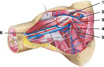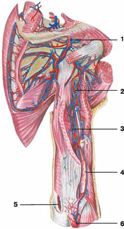 | Рис. 219. Артерии плечевого пояса и плеча 1 — надлопаточная артерия; 2 — глубокая артерия плеча; 3 — средняя коллатеральная артерия; 4 — лучевая коллатеральная артерия; 5 — верхняя локтевая коллатеральная артерия; 6 — возвратная лучевая артерия | |