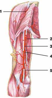 | Рис. 220. Артерии плеча 1 — грудоакромиальная артерия; 2 — глубокая артерия плеча; 3 — плечевая артерия; 4 — верхняя локтевая коллатеральная артерия; 5 — нижняя локтевая коллатеральная артерия | |