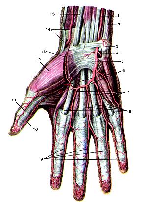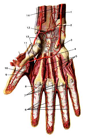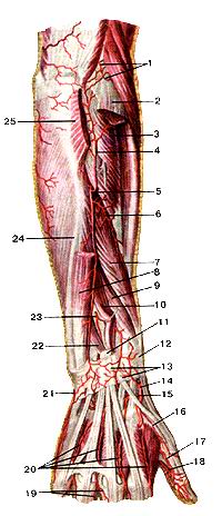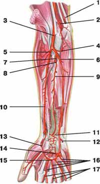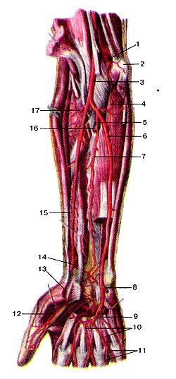 | ладонная поверхность 1 — верхняя локтевая коллатеральная артерия; 2 — нижняя локтевая коллатеральная артерия; 3 — плечевая артерия; 4 — локтевая возвратная артерия; 5 — лучевая возвратная артерия; 6 — локтевая артерия; 7 — общая межкостная артерия; 8 — задняя межкостная артерия; 9 — передняя межкостная артерия; 10 — лучевая артерия; 11 — ладонная запястная ветвь; 12 — глубокая ладонная ветвь; 13 — поверхностная ладонная ветвь; 14 — глубокая ладонная дуга; 15 — поверхностная ладонная дуга; 16 — общие ладонные пальцевые артерии; 17 — собственные ладонные пальцевые артерии | |