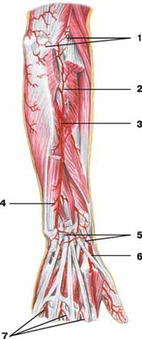 | тыльная поверхность 1 — суставная сеть локтя; 2 — возвратная межкостная артерия; 3 — задняя межкостная артерия; 4 — передняя межкостная артерия; 5 — дорсальная сеть запястья; 6 — лучевая артерия; 7 — дорсальные пальцевые артерии | |