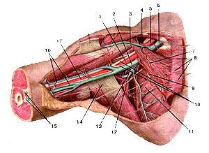 1-axillary artery; 2-axillary vein; 3-cephalic nein; 4-thoraco-acromis artery; 5-subclavian artery; 6-subclavian vein; 7-superior thoraci anery; 8-pectoralis major muscle (is cut and unfolded to the medif side); 9 -lateral thoracic artery; 10-trunks of brachial (nerve) plexus 11-serratus anterior (muscle); 12-thoracodorsal artery; 13-subscapula artery and vein; 14-tendon of latissimus dorsi muscle; 15-vasculonerv fascicle; 16-brachial veins; 17-brachial artery.