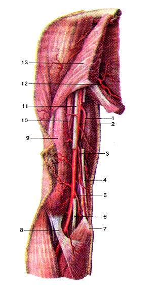 1-deep brachial artery; 2-brachial artery; 3-superior ulnar collateral artery; 4-ulnar nerve; 5-interior ulnar collateral artery; 6-median nerve; 7-medial epicodyle of humeris; 8-bicipital aponeurosis; 9-biceps brachii; 10-coracobrachialis; 11-median nerve; 12-subscapular artery; 13-pectoral major muscle.