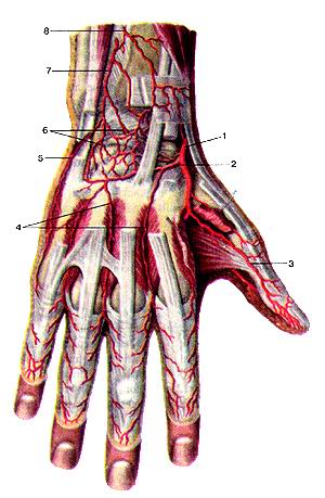Fig. 298. Arteries of right hand. Anterior aspect. I-radial artery; 2-dorsal сафа! branch of radial artery; 3-ulnar palmar artery of thumb; 4-dorsal interosseus arteries; 5-dorsal сафа! branch of ulnar artery; 6-dorsal сафа! arch; 7-dorsal interosseus artery; 8-dorsal branch of anterior interosseus artery.
