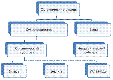 Количество биогаза, образующегося при анаэробной ферментации зависит, главным образом, от состава исходного субстрата. Органические отходы различного происхождения состоят из воды и сухих веществ, при этом сухое вещество включает органическую и неорганическую составляющие части (рис.1.1).