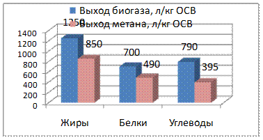 Наибольшее количество биогаза выделяется из жиров - 1250 л из килограмма органического сухого вещества (ОСВ). Белки и углеводы дают всего лишь 700 л/кг ОСВ и 790 л/кг ОСВ соответственно. Максимальное содержание метана в составе биогаза выделяется также из жиров – 850 л/кг ОСВ или 68% от общего количества биогаза. Из белков можно получить 490 л/кг ОСВ или 71%, в то время как углеводы дают только 395 л/кг ОСВ или 50% метана в газе (рис. 1.2).