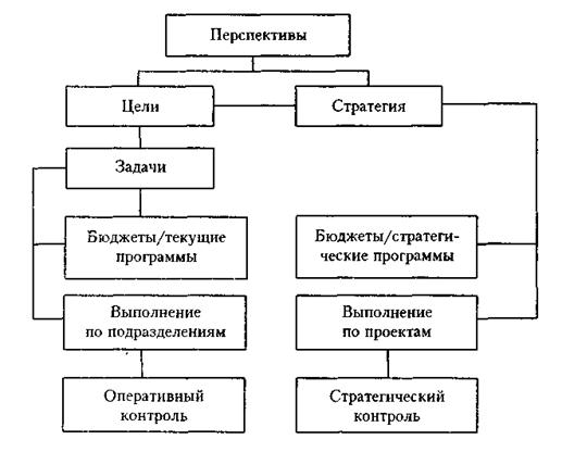 Как видно из схемы, перспективы и цели связаны между собой для выработки стратегии. Текущие программы ориентируют оперативные подразделения в их повседневной работе по обеспечению текущей рентабельности; стратегические программы и бюджеты закладывают основы будущей рентабельности, что требует создания системы исполнения, построенной на управлении проектами.
