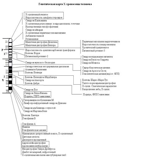 Х-сцепленные рецессивные – в своей основе имеют дефект гена, локализованного в половой Х-хромосоме (синдром Леша-Найхана, недостаточность глюкозо-6-фосфатДГ, синдром Барта). Женщина, унаследовав от одного из родителей патологический аллель, является гетерозиготой, т.е. фенотипически здорова; страдают только мужчины.