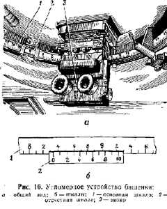 Измерение углов с помощью башенного угломера. На танках и боевых машинах для измерения угла поворота башенки имеется угломерное устройство (рис. 16, а). Основная шкала 1 устройства разбита на 600 делений, цена деления равна 0-10. Отсчетная шкала 2 имеет 10 делений по 0-01. Устройство позволяет снимать отсчеты угла поворота башенки с точностью до 0-01.