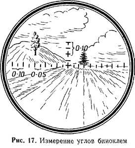 Измерение углов с помощью приборов наблюдения и прицеливания. В зрительной трубе бинокля имеются две взаимно перпендикулярные шкалы (сетки) для измерения горизонтальных и вертикальных углов с ценой большого деления 0-10, а малого 0-05. Чтобы измерить угол между двумя предметами, надо совместить какой-либо штрих шкалы с одним из них и подсчитать число делений против изображения второго. Умножив число делений на цену одного деления, получим величину измеряемого угла в тысячных. На рис. 17 горизонтальный угол (Между двумя отдельными деревьями равен 0-45, а вертикальный угол между основанием и вершиной отдельного дерева -0-15.