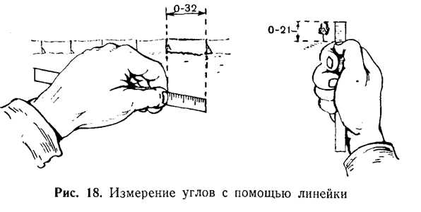 Измерение углов с помощью линейки. С помощью линейки с миллиметровыми делениями можно измерять углы в делениях угломера и градусах. Если линейку держать перед собой на расстоянии 59 см от глаза (рис. 18), то один миллиметр на линейке будет соответствовать двум тысячным (0-02). При измерении угла необходимо подсчитать на линейке число миллиметров между предметами (ориентирами) и умножить на 0-02. Полученный результат будет соответствовать величине измеряемого угла в тысячных. На рис. 18 угол между столбами равен 0-32, а высота дерева--0-21.