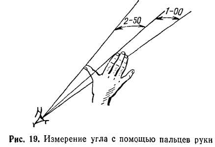 Для приближенного измерения углов на местности могут служить пальцы руки, вытянутой на расстояние 50 см от глаза. Угол между линиями визирования на сомкнутые указательный, средний и безымянный пальцы равен 1-00 (рис. 19), а на разведенные до отказа большой и указательный пальцы-2-50.