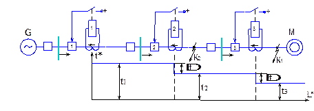При кз, например, в точке К1, ток кз проходит по всем участкам сети, расположенным между источником питания и местом повреждения, таким образом приходят в действие все защиты однако по условиям селективности должна сработать на отключение только 3 защита. Для обеспечения такой селективности МТЗ, выполняются с выдержками времени нарастающими от потребителя к источнику питания. Соответственно при кз в точке К2, быстрее всех срабатывает защита 2, а защита 1, имеющая большее время, не подействует. Рассмотренный принцип подбора выдержек времени называются ступенчатым.