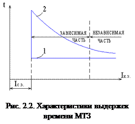 МТЗ могут выполняться с выдержками времени, не зависящими от тока в защищаемом участке (кривая 1 рис. 2.2), такие защиты при повреждении в любой точке защищаемого участка действуют с постоянной не зависимой от тока выдержкой времени. В таких защитах выдержка времени, создается специальным реле времени (защита с независимой характеристикой времени срабатывания). Также МТЗ могут выполняться с выдержками времени, зависящими от величины тока в защищаемом участке, то есть по мере увеличения тока время срабатывания уменьшается кривая (2, рис.2.2). Такой характер выдержек времени имеет МТЗ, выполненная, например: индукционным реле тока или плавкими предохранителями – защита с зависимой или с ограниченно зависимой характеристикой времени срабатывания.