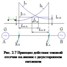 Ток срабатывания выбирается большим из двух значений полученных по условиям (2.12, 2.13). На рис. 2.7 lотс.А, lотс.В – соответственно зоны действия отсечек А и В, l0 – зона, защищаемая обеими отсечками.