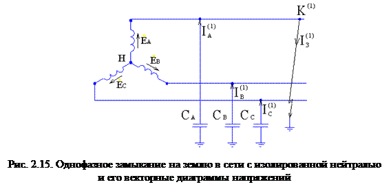 В сетях переменного тока при нормальной работе, наряду с рабочими токами нагрузки по фазам проходят токи обусловленные емкостями фаз по отношению к земле. При этом распределенные емкости фаз могут быть заменены сосредоточенными емкостями СА, СВ, Сс, напряжения фаз по отношению к земле равны соответствующим фазным напряжениям UA, UB, UC, относительно нейтрали системы. Векторы фазных напряжений образуют симметричную звезду, в результате напряжение нейтрали системы по отношению к земле равно нулю, а через сосредоточенные емкости протекают равные по величине токи, опережающие соответствующие напряжения на 900, то есть