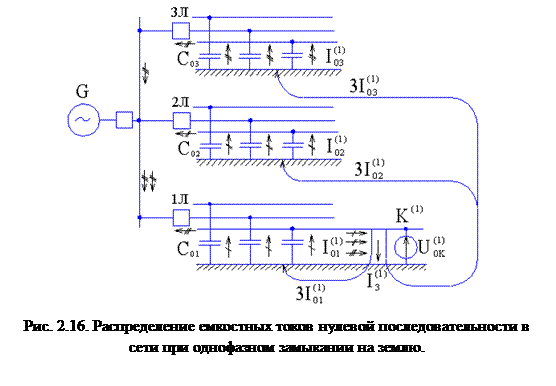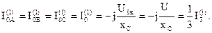 Токи, возникающие под действием U0к, замыкаются через емкости фаз относительно земли, токи нулевой последовательности всех фаз равны между собой и вычисляются следующим образом: