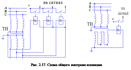 Замыкание на землю одной фазы в сетях с изолированной нейтралью еще не является аварией, так как потребители включенные на линейные напряжения продолжают работать, что дает возможность выполнять защиту действующую на сигнал. Схема устройства рис. 2.17 состоит из трех максимальных реле напряжения включенных на напряжение фаз по отношению к земле рис. 2.17, или из одного максимального реле напряжения, включенного на напряжение нулевой последовательности (схемы срабатывают, так как было указанно ранее при однофазных замыканиях возникают напряжения нулевой последовательности и фазные напряжения увеличиваются в