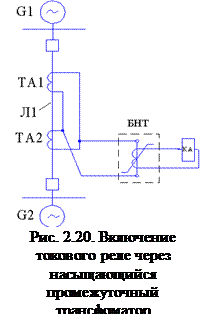 Для ограничения максимального тока небаланса – I нб.maх. расч, существующего во время переходного процесса, и обусловлено апериодической составляющей первичного тока, токовое реле включают через БНТ, как показано на рис. 2.20. Данная схема работает следующим образом: при появлении апериодической составляющей в первичном токе при внешнем КЗ, по вторичным обмоткам трансформаторов ТА1 и ТА2 будут протекать значительные токи намагничивания