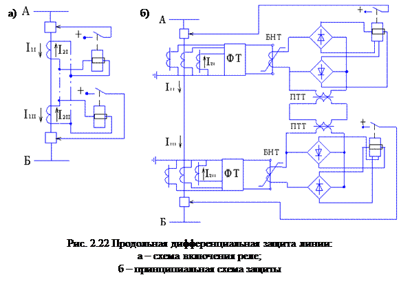, при номинальном вторичном токе I2ном.=5А, и допустимой нагрузки для трансформатора тока, сопротивление соединительных проводов R должно быть не более 1÷2 ом. В этом случаи дифференциальная защита может быть использована на ЛЭП длиной всего несколько сотен метров. При больших длинах снижение нагрузки на трансформатора тока достигается использованием промежуточных трансформаторов тока (ПТТ) – (рис. 2.22). В схемах применяют реле тока дифференциального типа – 1ТД, 2ТД. В качестве вспомогательных проводов желательно использовать существующие кабели телемеханики. Для осуществления защиты действующей при всех видах КЗ, необходимо использовать шести дифференциальных реле и не менее четырех вспомогательных проводов. Для уменьшения числа вспомогательных проводов и реле в схеме используют комбинированные фильтры, на выходе которых получают токи пропорциональные I1+К2I2 или I1+К0I0. Использование таких фильтров позволяет сократить число реле вспомогательных проводов до двух, и тем самым снизить вероятность нарушения связи между трансформаторами тока.