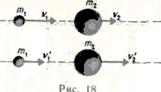 (рис. 18). При прямом центральном ударе векторы скоростей шаров до и после удара лежат на прямой линии, соединяющей их центры. Проекции векторов скорости на эту линию равны модулям скоростей. Их направления учтем знаками: положительное значение припишем движению вправо, отрицательное — движению влево. В этом случае законы сохранения имеют вид